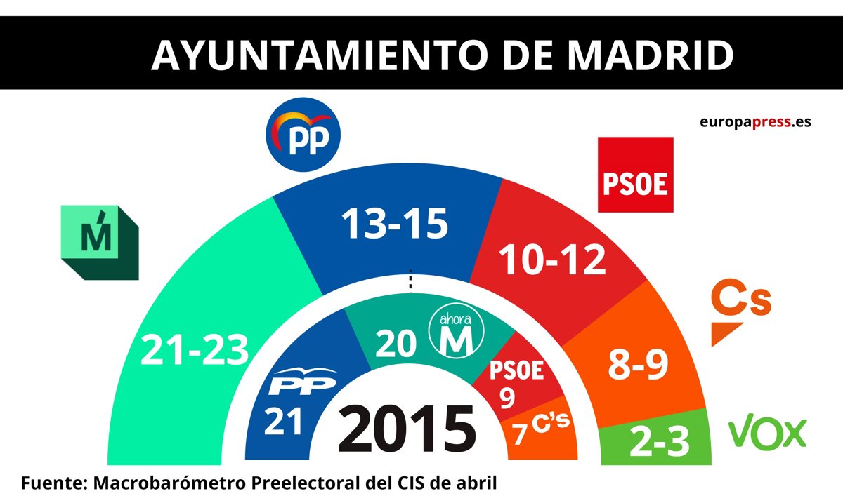 Concretamente, el CIS otorga entre 6 y 8 escaños menos a la candidatura liderada por José Luis Martínez Almeida respecto a los 21 actuales que tiene ahora el Grupo Municipal Popular y desciende a la segunda posición como fuerza más votada en la ciudad al quedarse en el 23,8 por ciento de intención de voto.