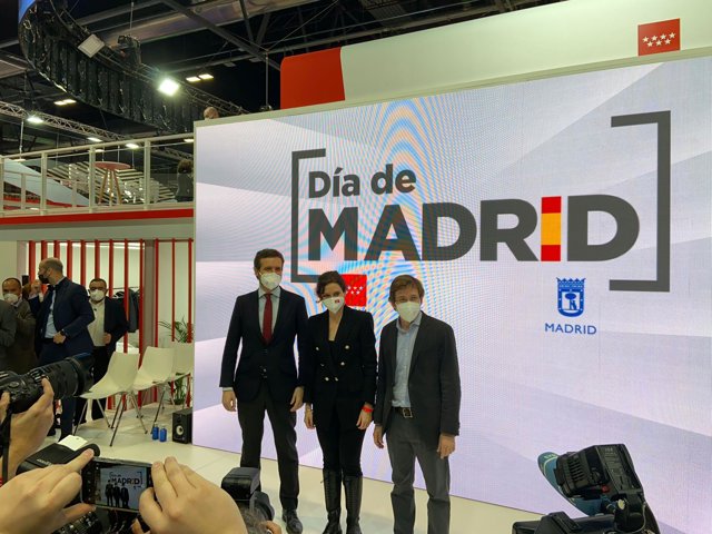 El presidente del PP, Pablo Casado, la presidenta de la Comunidad de Madrid, Isabel Díaz Ayuso, y el alcalde de Madrid, José Luis Martínez-Almeida, han mostrado unidad este viernes, pese a la polémica sobre la convocatoria del congreso del PP regional, por el Día de Madrid en Fitur.