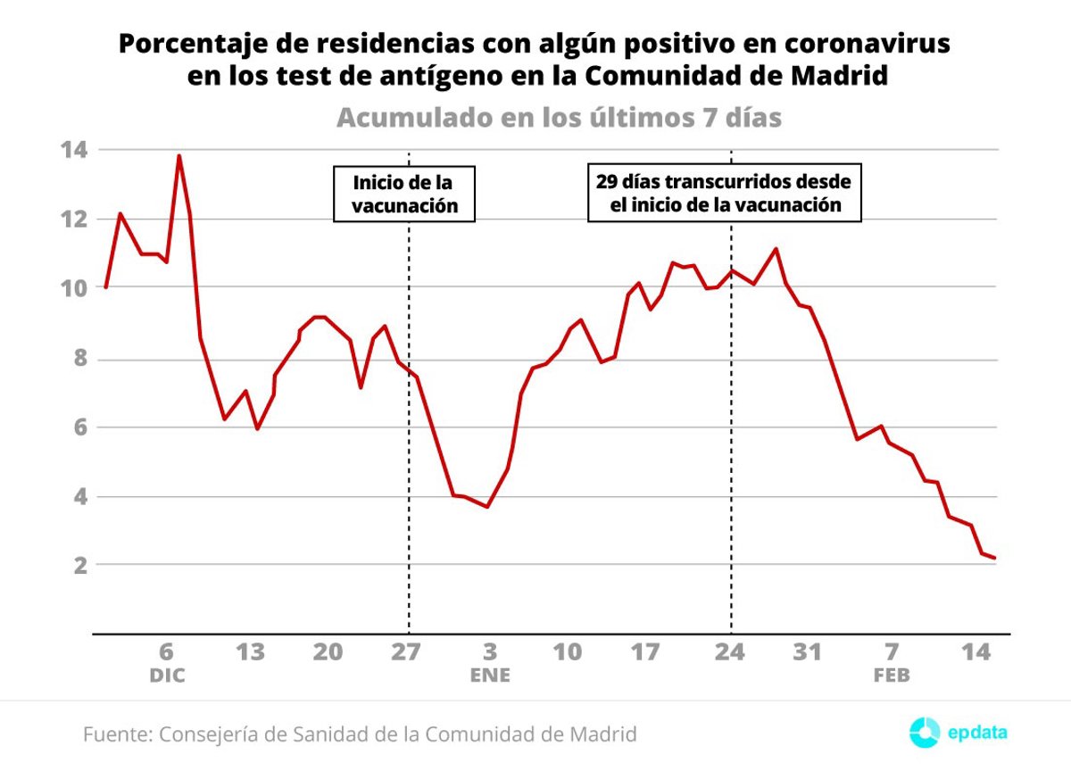 En concreto, se observa una caída del número de residencias con casos positivos a partir de los 28 días después del inicio de la vacunación, y, a fecha de 14 de febrero, el porcentaje de residencias con algún positivo es del 2%, cuando en el periodo previo a la vacunación ese porcentaje llegó hasta un 14%.