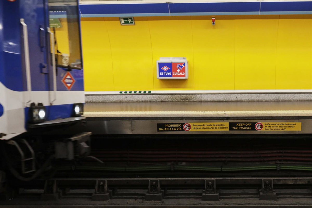 Un tren de metro entra en una estación en la que se ve uno de los carteles que la Comunidad de Madrid ha instalado a lo largo del borde del andén en las estaciones del Metro de Madrid. - Jesús Hellín - Europa Press
