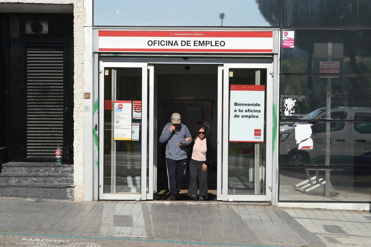 Dos personas en la entrada de una oficina de empleo, a 6 de mayo de 2025, en Madrid (España). - Gustavo Valiente - Europa Press