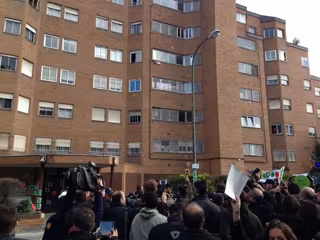 Los activistas antidesahucio han llegado a la vivienda de la diputada popular sobre las siete menos cuarto de la tarde. En el portal de la vivienda han colocado una veintena de pegatinas de 'Si se puede' bajo la atenta mirada de los vecinos del edificio, que ante el revuelo han comenzado a asomarse a sus ventanas.