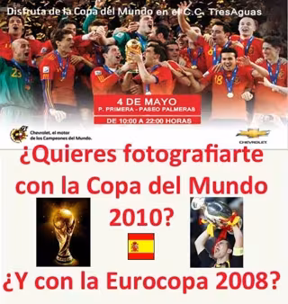 Chevrolet España (patrocinador oficial de la Selección), Talleres Prizán (concesionario Oficial de Alcorcón) y la Real Federación Española de Fútbol, traen al centro comercial TresAguas la Copa del Mundial de Fútbol 2010 y la Eurocopa 2008, ha informado el centro en un comunicado.