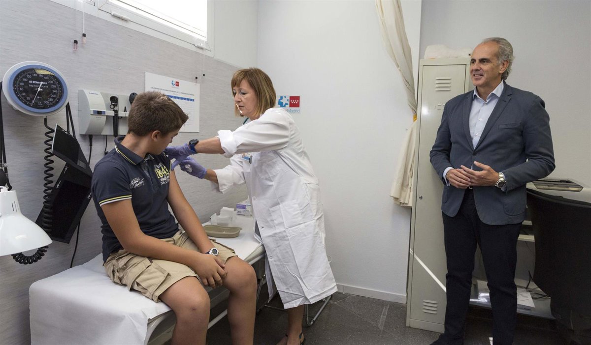 El consejero en funciones de Sanidad, Enrique Ruiz Escudero, ha visitado este jueves una consulta del Centro de Salud Barrio del Pilar (en el distrito de Fuencarral) en la que los profesionales de Enfermería han comenzado a administrar la vacuna a los niños de 12 años y adolescentes.