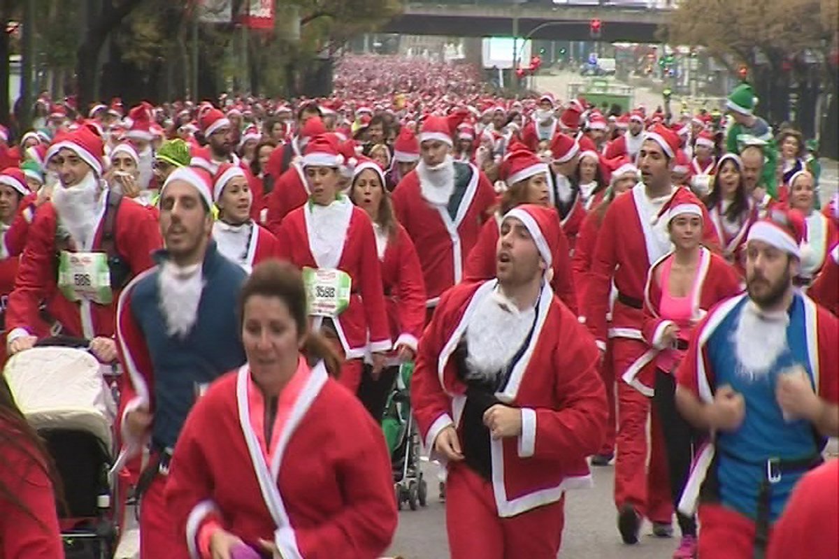 Cerca de 10.000 Papá Noeles han llenado las calles de Madrid en la cuarta edición de la Carrera de Papá Noel, que se ha disputado sobre 5,5 kilómetros con salida y meta en el aparcamiento del Santiago Bernabéu.
