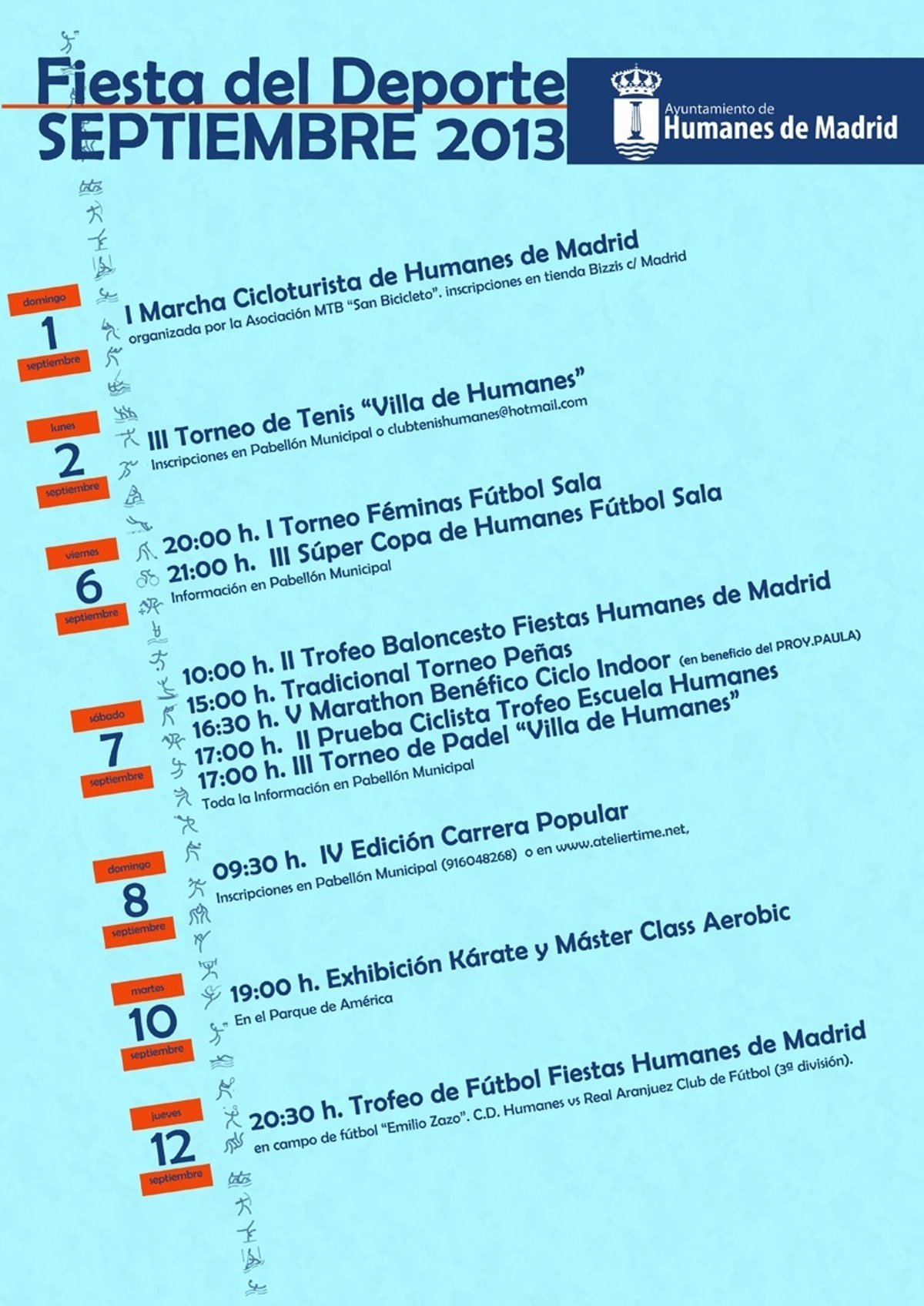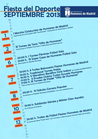 Cerca de 2.000 personas participarán en la fiesta del Deporte de Humanes que arranca este domingo como preámbulo para los festejos populares 2013 en honor al Santísimo Cristo de la Agonía que comenzarán el 13 de septiembre, según ha informado el Consistorio este jueves a través de un comunicado.