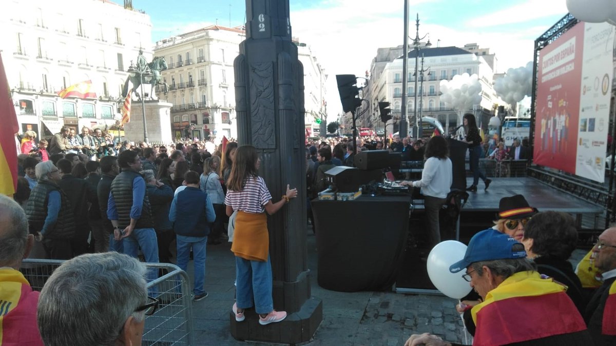 Cerca de 400 personas han acudido este domingo a la Puerta del Sol para manifestarse por la "convivencia sin violencia" en Cataluña, una concentración en la que ha habido críticas a la actuación del presidente del Gobierno en funciones y secretario general del PSOE, Pedro Sánchez.