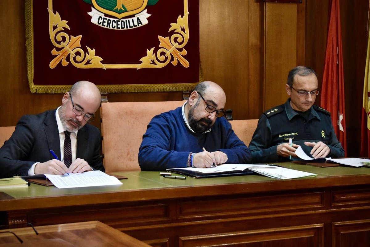 El delegado del Gobierno, Francisco Martín, el alcalde de Cercedilla, David José Martín, y el jefe de la Comandancia de la Guardia Civil en Madrid, el coronel Carlos de Miguel, firman el acuerdo de adhesión del municipio al sistema VioGén - DELEGACIÓN DEL GOBIERNO EN MADRID