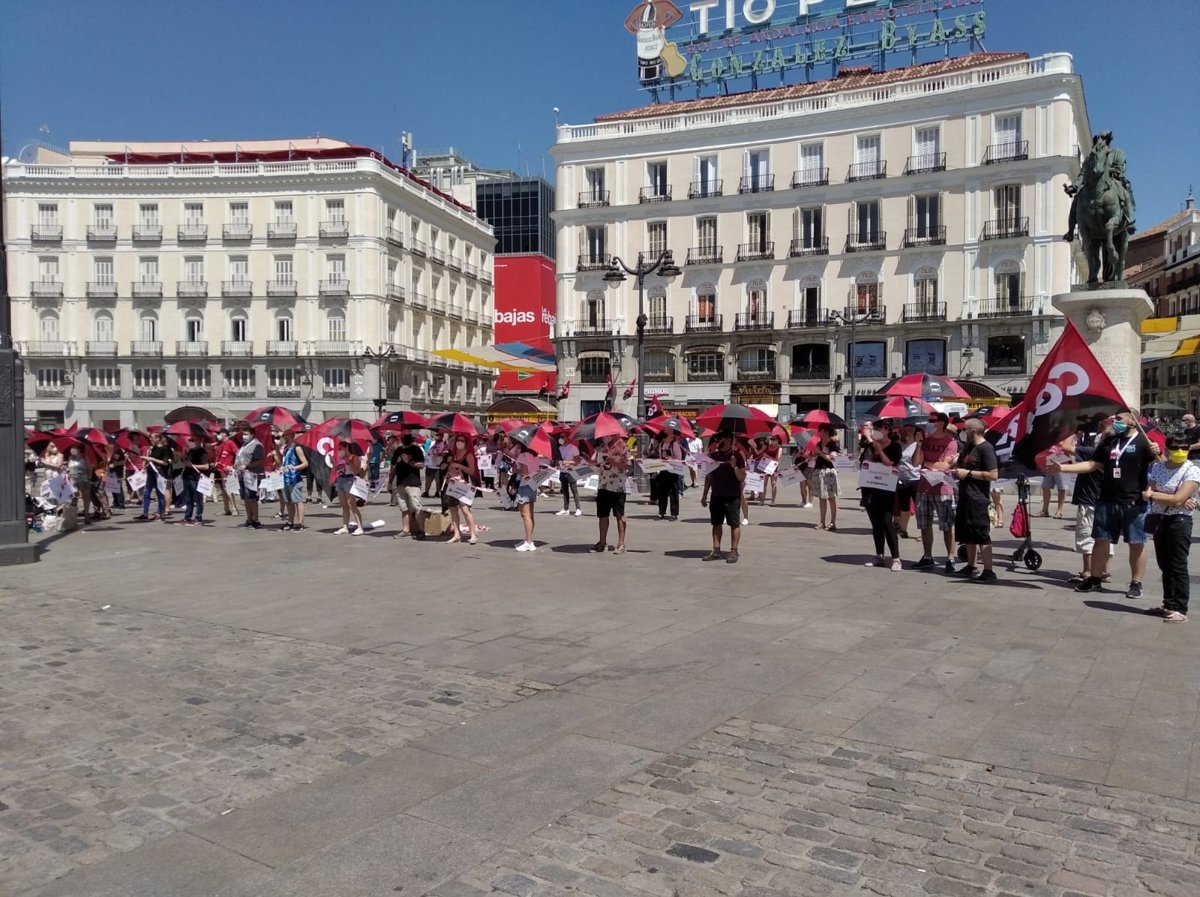 Un centenar de personas de la Confederación General de Trabajadores (CGT) se ha concentrado este mediodía en la Puerta del Sol, con paraguas y respetando las distancias de seguridad, para pedir la dimisión de la presidenta de la Comunidad de Madrid, Isabel Díaz Ayuso, por la gestión de la crisis del coronavirus, y para exigir que esta nueva crisis no la paguen los colectivos más vulnerables y precarios.