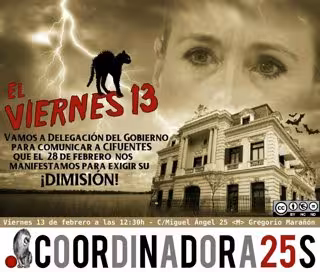 De hecho, han anunciado que el viernes acudirán a la sede de la Delegación del Gobierno, situada en la calle Miguel Ángel de Madrid, para escenificar dicho trámite administrativo. Así, coincidiendo en que la fecha es un viernes 13 han confeccionado un cartel 'terrorífico' con la imagen de Cifuentes y la sede de la institución rodeada de vampiros, rayos y un gato negro.