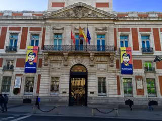 La fachada de la Real Casa de Correos, sede del Gobierno de la Comunidad de Madrid, ha amanecido este lunes con dos carteles en apoyo al opositor venezolano Leopoldo López, con la imagen del preso y el lema 'Libertad ya'.