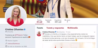 La expresidenta de la Comunidad de Madrid Cristina Cifuentes ya ha eliminado de su perfil de Twitter su condición de máxima dirigente del Gobierno autonómico aunque mantiene el de líder del PP de Madrid.
