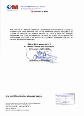 La circular está fechada a 21 de agosto --justo el mismo día que Cifuentes anunció una tarjeta específica para este colectivo-- y está firmada por el director General de Coordinación de la Asistencia Sanitaria, César Pascual.