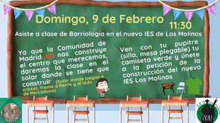 La Plataforma 'IES Los Molinos Getafe Ya' ha convocado para las 11.30 horas de este domingo una clase de 'Barriología' en la parcela donde se proyecta construir el instituto público de Los Molinos. Con esta acción, las familias de este barrio de Getafe exigen a la Comunidad de Madrid "que cumpla con su compromiso" y ponga en marcha "cuanto antes" la construcción del centro educativo.