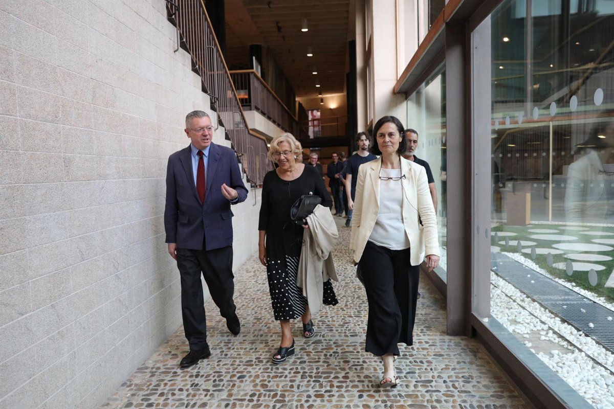 Los exalcaldes de Madrid Manuela Carmena y Alberto Ruiz-Gallardón y la directora del Colegio de Arquitectos de la capital (COAM), Belén Hermida, asisten al ciclo de diálogos 'Repensar Madrid'. - Jesús Hellín - Europa Press - Archivo