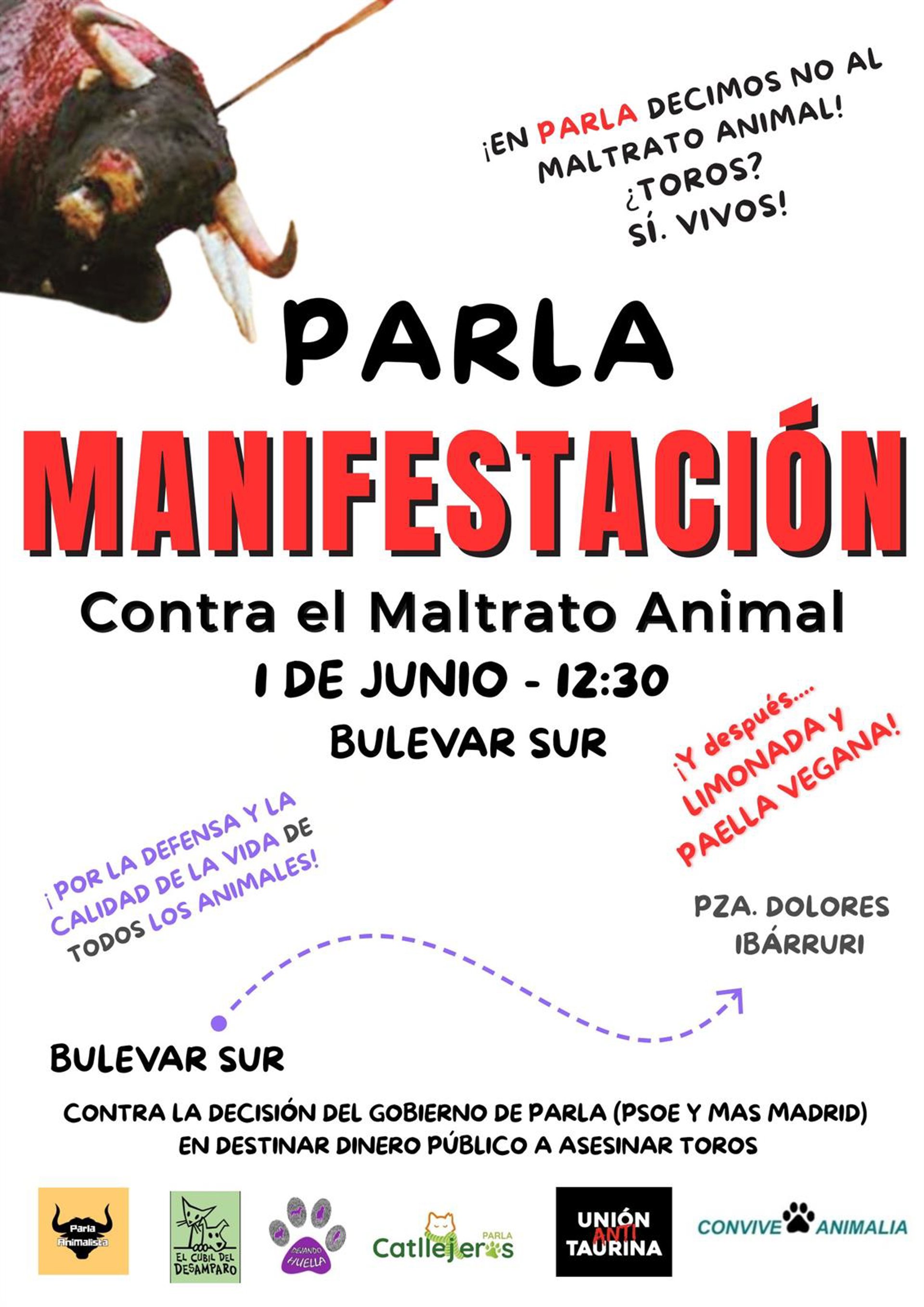 La manifestación, impulsada por organizaciones como Parla Animalista, El Cubil de Desamparo, Unión Antitaurina, Convive Animalia o Dejando Huella, entre otras, tiene el objetivo de mostrar el rechazo social a una política municipal que "contradice los principios de respeto y bienestar animal".