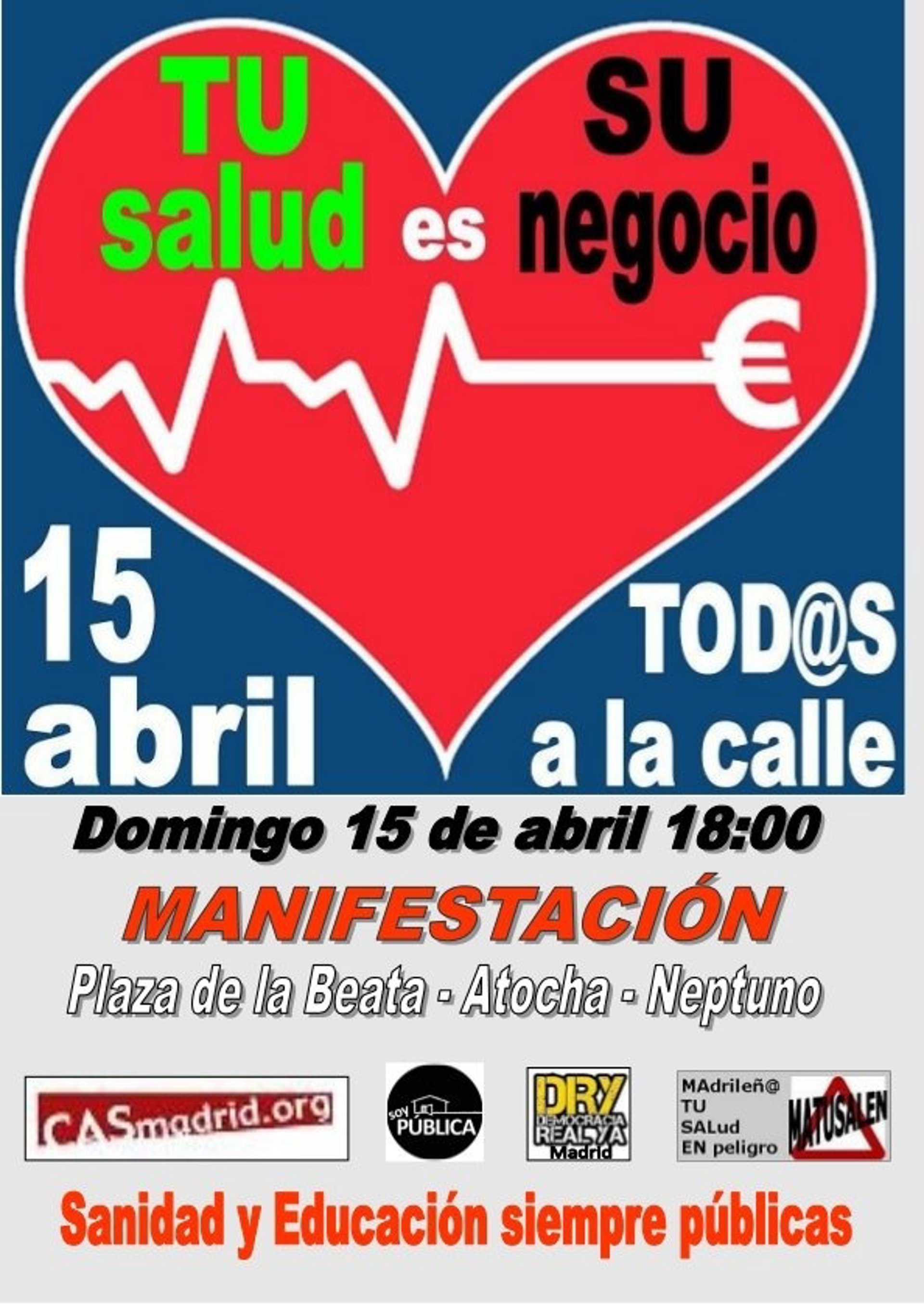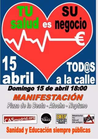 Varios colectivos en defensa de la Sanidad pública han convocado una manifestación para este domingo 15 de abril que marchará desde la plaza de la Beata hasta Neptuno bajo el lema 'Tu salud es su negocio'.
