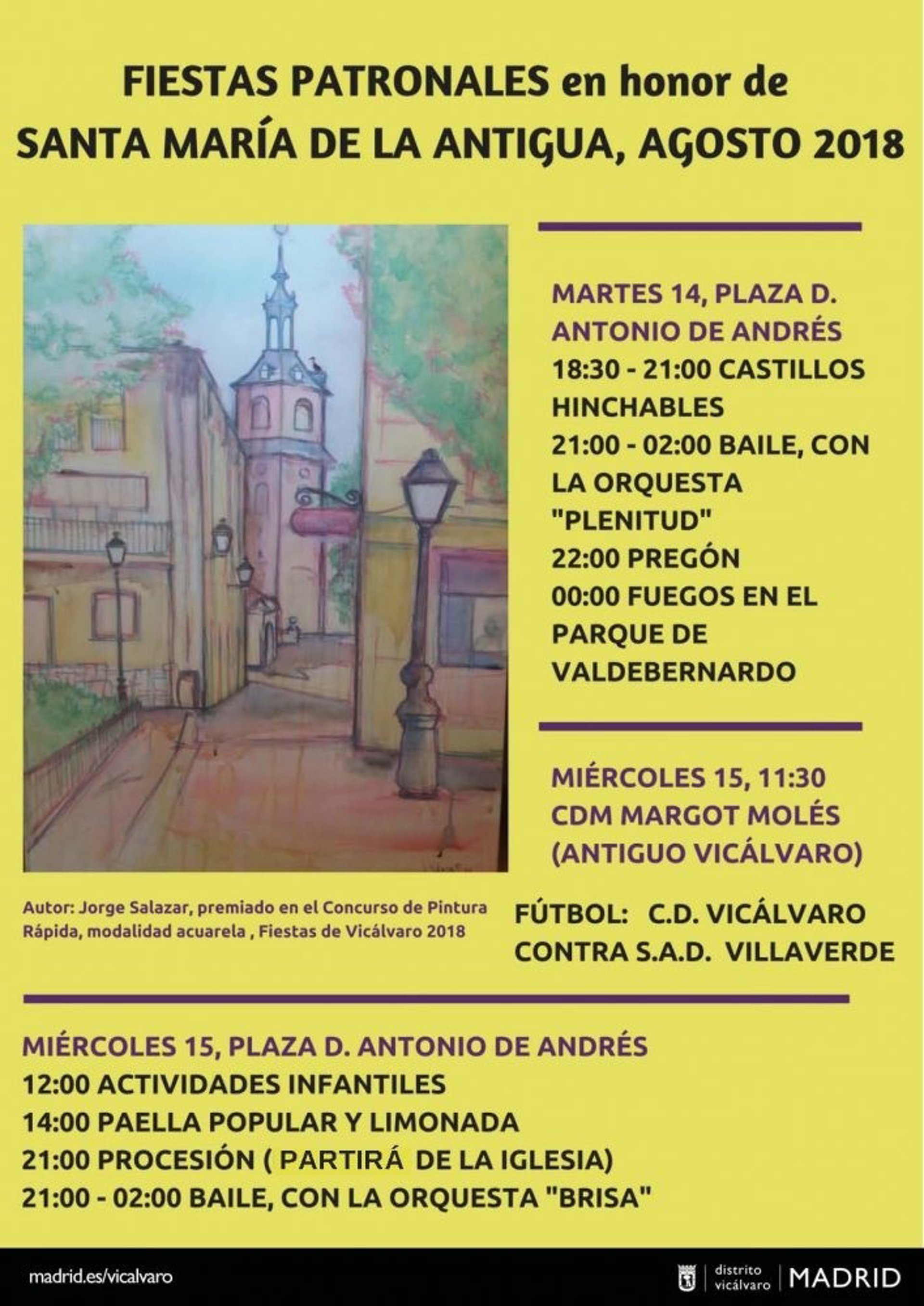 El Trofeo Virgen de la Antigua del Club Deportivo Vicálvaro llega a su 74 edición estas fiestas. El equipo, que recientemente ha logrado el ascenso a Tercera División, jugará un partido amistoso con el S.R. Villaverde-Boetticher C.F el 15 de agosto en el campo del renovado Centro Deportivo Municipal Margot Moles.