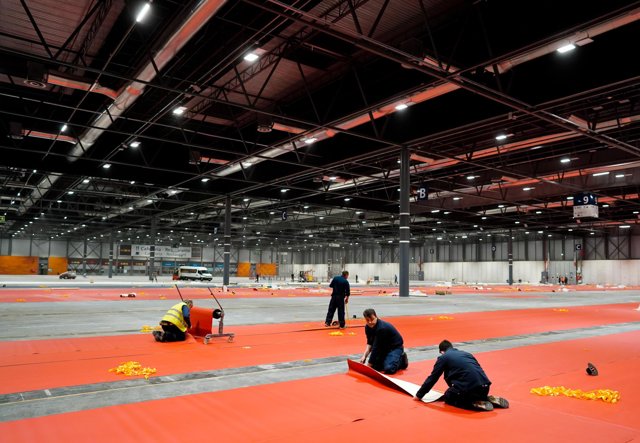 Desde el Gobierno regional han distribuido unas imágenes en las que se ve a operararios, protegidos con mascarillas, en el pabellón 9, comenzando las labores de montaje. En primer lugar, han colocado un tapiz sobre el suelo original.