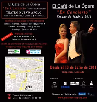 Los cantantes líricos también actuarán en el patio de butacas, junto a los espectadores, haciendo participar al público. También se puede encontrar información de la Compañía Lírica de El Café de la Ópera en www.elcafedelaopera.com