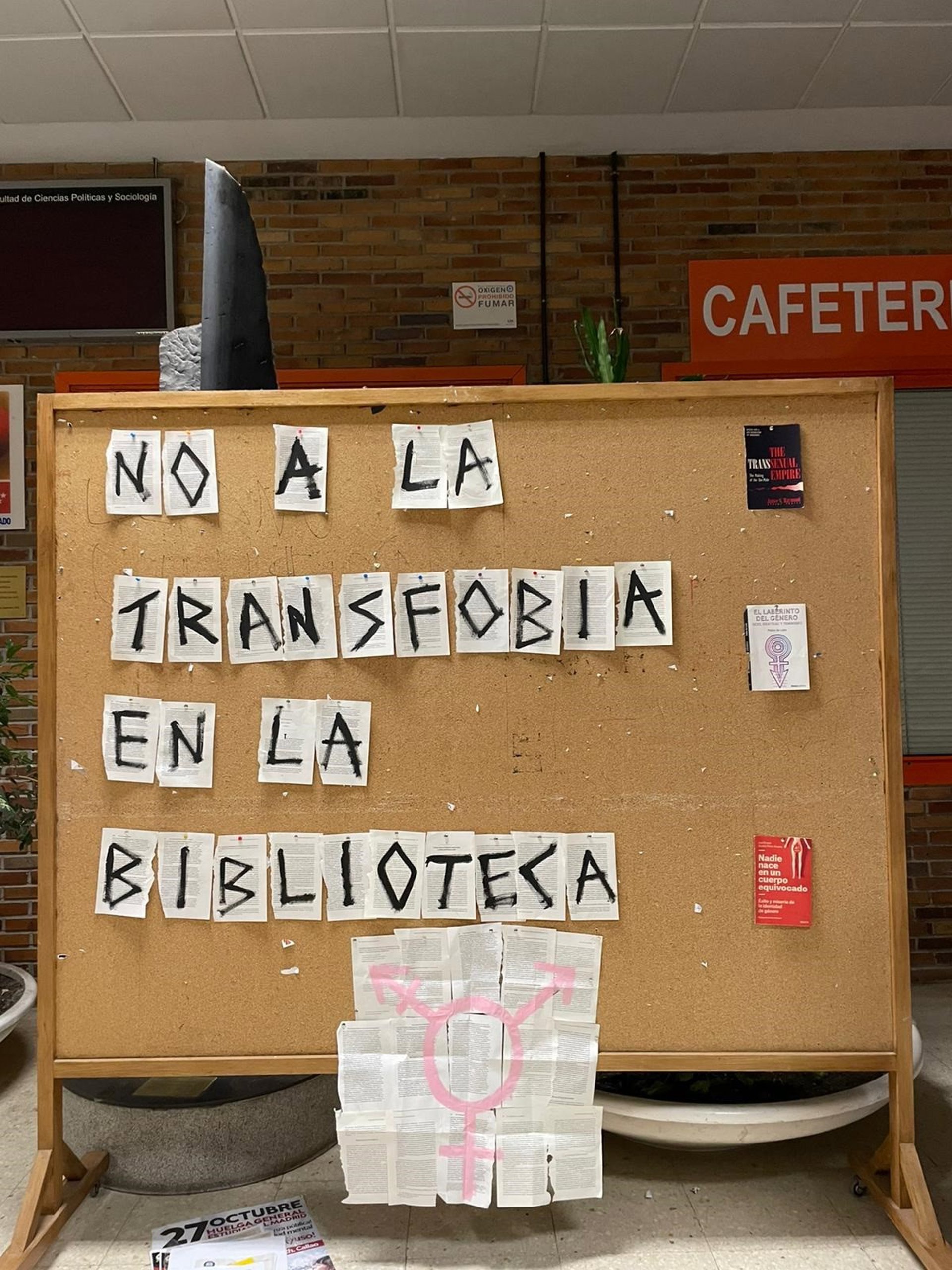 La asociación 'TransMariBiBollo' RQTR (Erre Que Te Erre) ha difundido en redes sociales imágenes con cartelería instalada en espacios del campus de Somosaguas en protesta por la "transfobia" de profesores y de la Universidad. "Queremos todos los libros tránsfobos fuera de nuestras bibliotecas y el fin de los discursos de odio en nuestra universidad", indican.