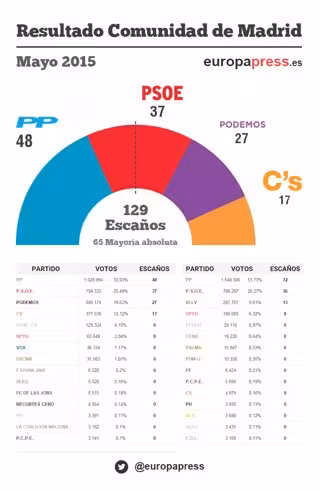 Por su parte, Podemos irrumpe en la Asamblea de Madrid como tercera fuerza más votada, con el 18,67 por ciento de los votos, y 27 diputados, al mismo tiempo que Ciudadanos también entra por primera vez con el 11,98 por ciento y 17 diputados.