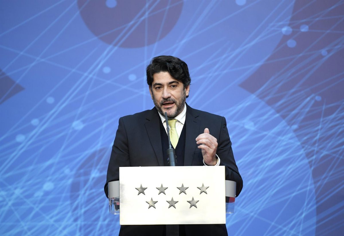 Archivo - El consejero de Vivienda y Administración Local interviene durante el acto de presentación de la finalización de los trabajos para la llegada de la fibra óptica a los municipios de menos de 2.500 habitantes, en Madrid, (España), a 5 de febrero - EUROPA PRESS/O.CAÑAS.POOL - Europa Press - Archivo