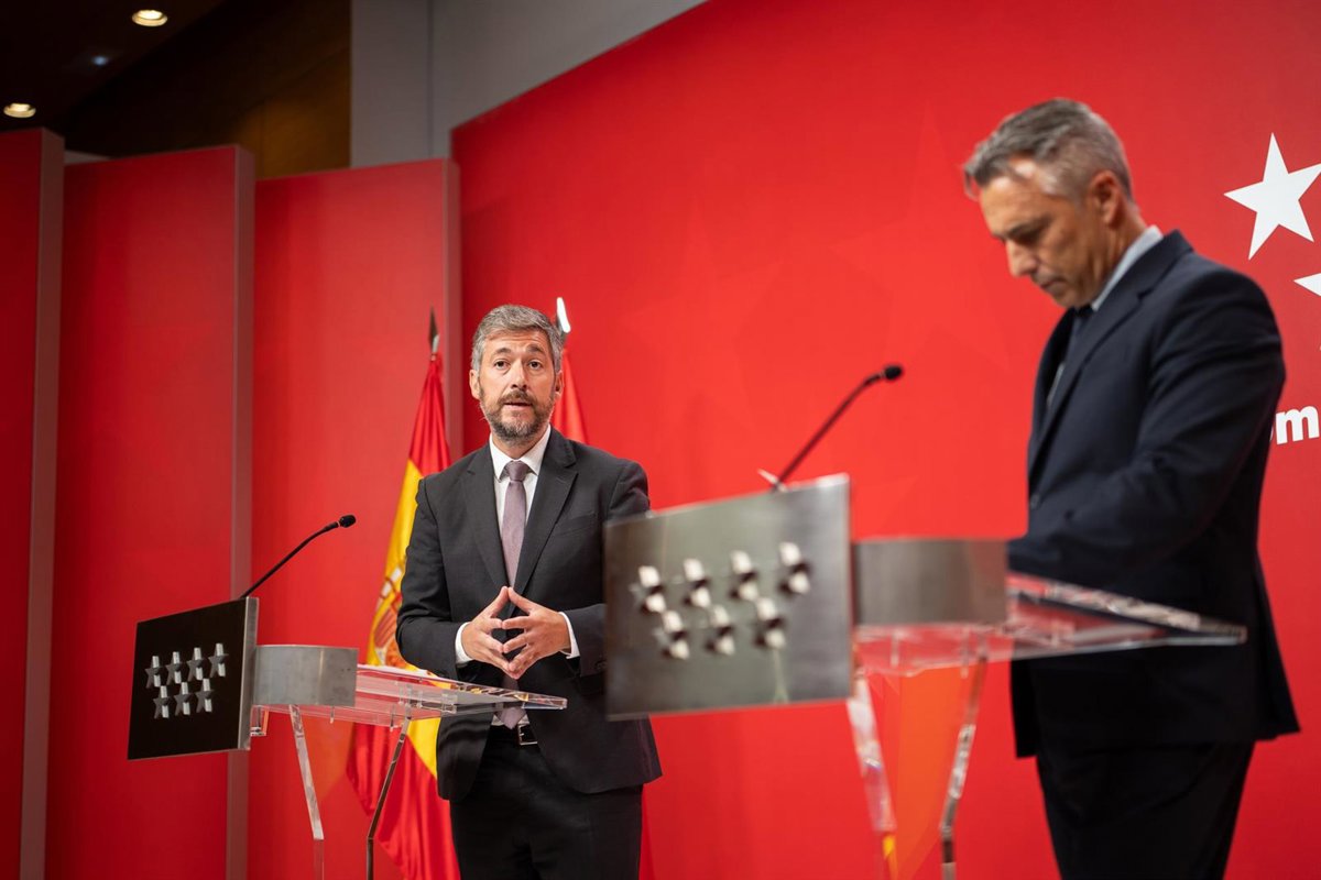 El consejero de Presidencia, Justicia y Administración Local, y portavoz del Gobierno autonómico, Miguel Ángel García Martín (i), y el consejero de Medio Ambiente, Agricultura e Interior Carlos Novillo (d), en rueda de prensa. - Alejandro Martínez Vélez - Europa Press