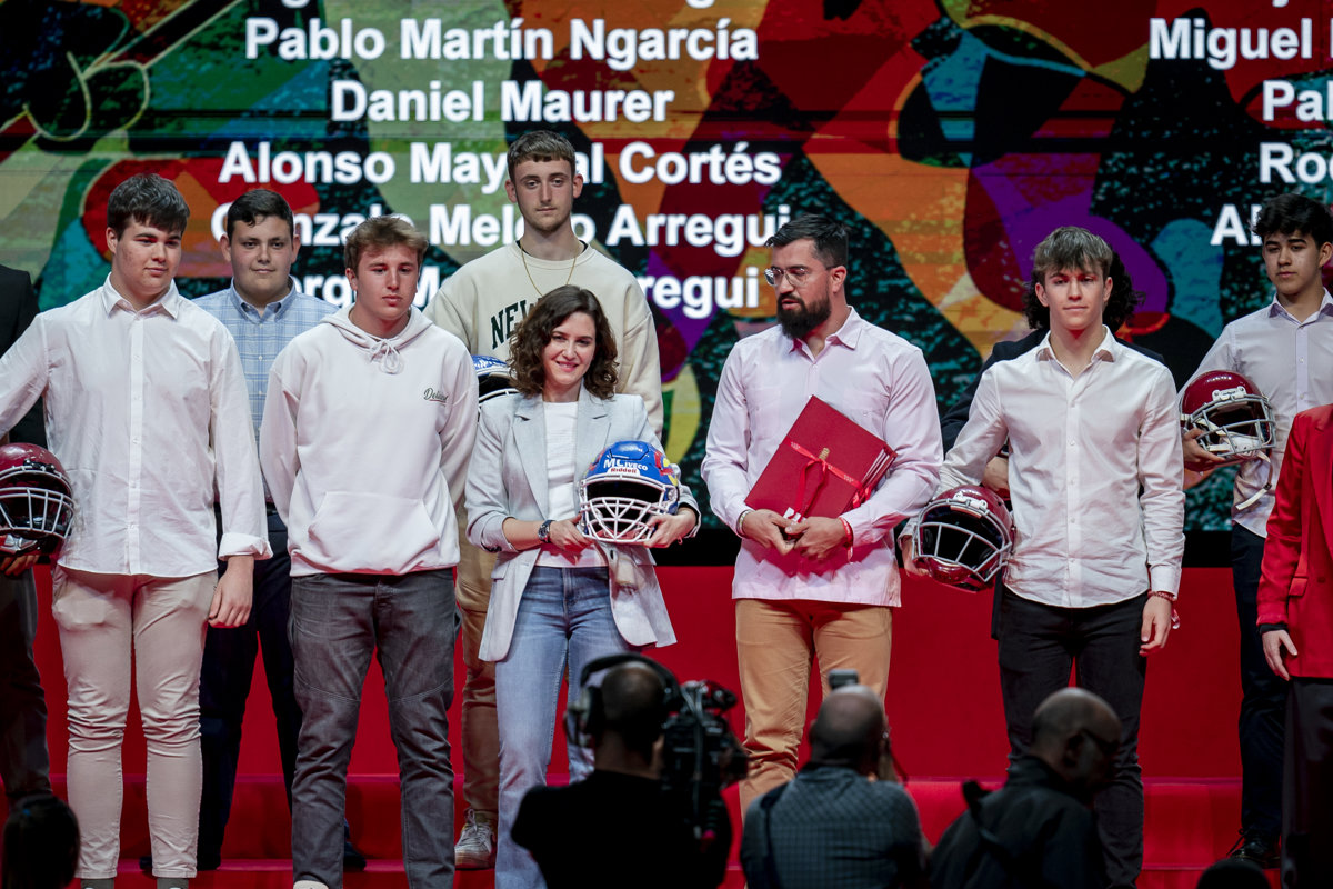 La presidenta de la Comunidad de Madrid, Isabel Díaz Ayuso, entrega el premio a la Federación Madrileña de Fútbol Americano durante la Gala del Deporte 2023, en el WiZink Center, a 27 de marzo de 2023, en Madrid (España). - A. Pérez Meca - Europa Press