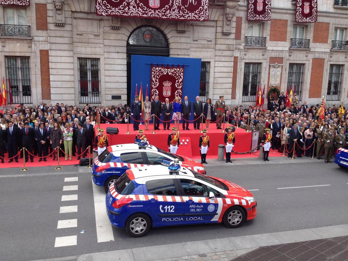 Esta entrega de flores ha sido seguida por varios centenares de personas que esperaban desde primera hora de la mañana en los tres graderíos montados para la ocasión en el kilómetro cero, y que este año se han quedado sin ver a la patrulla águila cruzar el cielo madrileño, una intervención que ha sido anulada por cuestión de presupuesto.