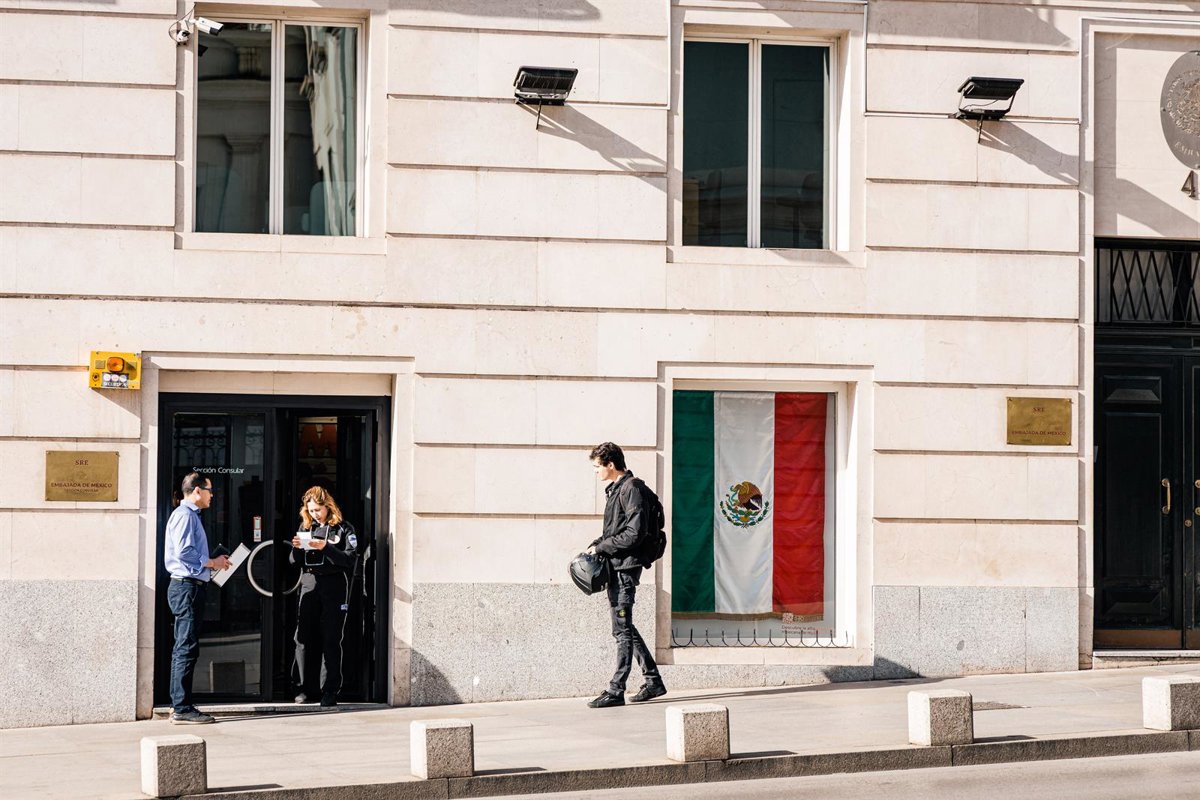 Varias personas frente a la Embajada de México, a 20 de abril de 2026, en Madrid (España). Hoy arranca de forma presencial la regularización extraordinaria de migrantes impulsada por el Gobierno - Carlos Luján - Europa Press
