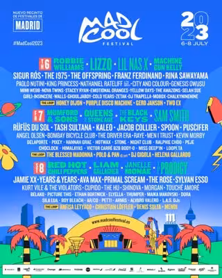 El cartel definitivo de Mad Cool Festival 2023 se compone de 101 bandas, con nombres tan relevantes como The Black Keys, Red Hot Chili Peppers, Lizzo, Queens of the Stone Age, Sam Smith, The 1975, Nova Twins, Robbie Williams, Lil Nas X, Franz Ferdinand, Tash Sultana, Paolo Nutini, Rina Sawayama, Jamie XX o Machine Gun Kelly, entre otros.