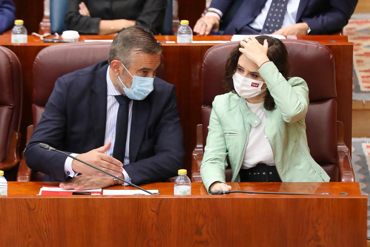 El consejero de Presidencia, Justicia e Interior, Enrique López, conversa con la presidenta de la Comunidad de Madrid, Isabel Díaz Ayuso. - Marta Fernández Jara - Europa Press