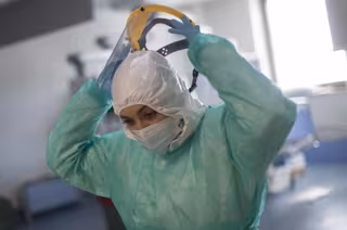 Una sanitaria se retira la pantalla protectora en la Unidad de Cuidados Intensivos (UCI) dedicada a enfermos de coronavirus del Hospital Universitario Ramón y Cajal - Eduardo Parra - Europa Press
