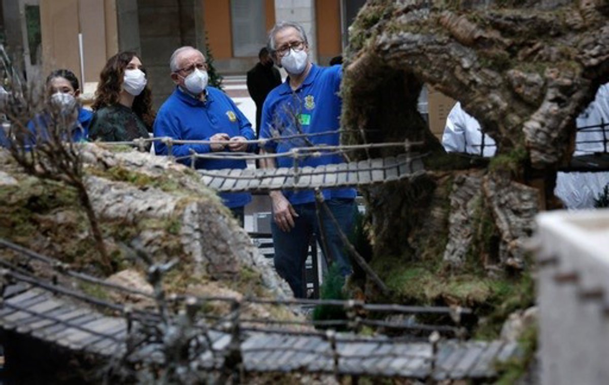 Ayuso ha comprobado este fin de semana cómo la Asociación de Belenistas de Madrid ultima los preparativos en la Real Casa de Correos del tradicional Belén con motivo de las fiestas navideñas. En esta ocasión, el montaje vuelve de nuevo a instalarse en el patio de la sede del Gobierno regional, después de que el año pasado se tuviera que localizar fuera por la pandemia.