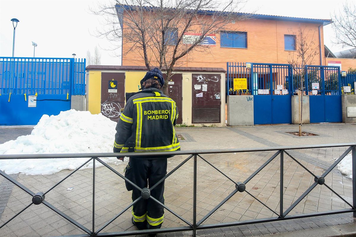 Un bombero en la entrada del colegio público Ausis March el primer día de reapertura tras la gran nevada registrada por el paso de `Filomena , en el distrito de Villaverde, Madrid (España), a 20 de enero de 2021. - Ricardo Rubio - Europa Press