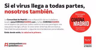 Así lo ha avanzado la presidenta regional, Isabel Díaz Ayuso, quien ha desgranado que esta ya está disponible en App Store y Google Play para su descarga. La aplicación móvil se suma a la página www.coronamadrid.com, estrenada hace ahora cuatro días, visitada ya por más de dos millones de internautas y que ha realizado 200.000 autoevaluaciones del coronavirus.
