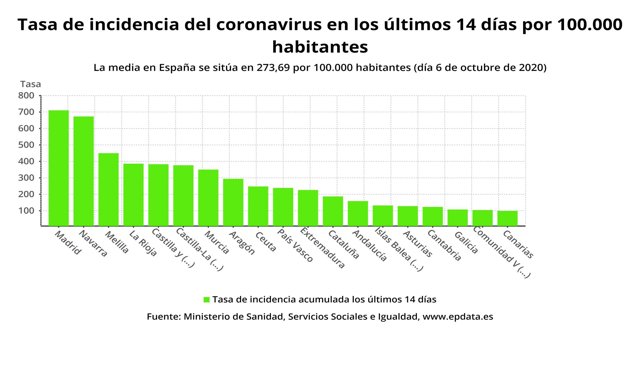 De los 4.030 nuevos casos, 1.690 se han localizado en Madrid, si bien 261 en Andalucía, 280 en Aragón, 84 en Asturias, 17 en Baleares, 74 en Canarias, 37 en Cantabria, 70 en Castilla-La Mancha, 43 en Castilla y León, 152 en Cataluña, 14 en Ceuta, 213 en Comunidad Valenciana, 151 en Extremadura, 154 en Galicia, 17 en Melilla, 105 en Murcia, 272 en Navarra, 323 en País Vasco y 73 en La Rioja.