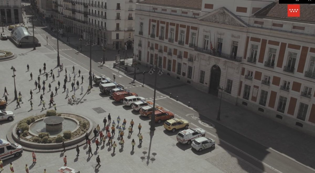 Con imágenes de sanitarios, bomberos y miembros de las Fuerzas y Cuerpos de Seguridad del Estado recorriendo zonas emblemáticas de Madrid ataviados con sus mascarillas, el Ejecutivo autonómico ha incidido en que, en esta ocasión, también "hay dolor" pero como aquella vez "también hay héroes".
