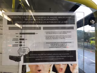 Ahora aparecen estos carteles, no firmados, en autobuses y marquesinas en los que se dice que "Cifuentes y el PP de la Comunidad de Madrid han decidido sin contar con el Ayuntamiento congelar la asignación de autobuses de la EMT". "Cifuentes aumenta el presupuesto a todos excepto a la EMT", reza el cartel, que indica que quieren una EMT "de calidad", algo que "es posible".