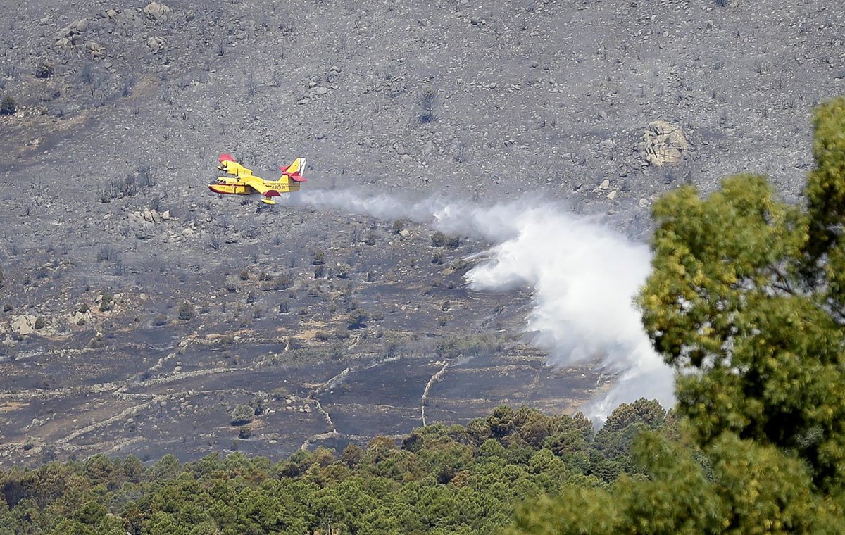Archivo - Imagen de recurso de un avión apaga incendios de la Unidad Militar de Emergencias (UME) virtiendo agua sobre un incendio forestal originado en el término municipal de Robledo de Chavela (Madrid). - Comunidad de Madrid - Archivo