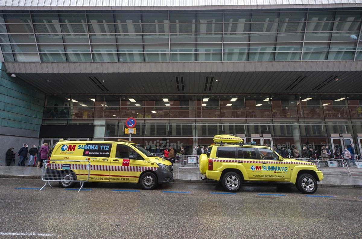 Archivo - Varias ambulancias aparcadas en las inmediaciones del dispositivo puesto en marcha en el Wizink Center para administrar la primera dosis de la vacuna AstraZeneca contra el Covid-19, a 9 de abril de 2021, en Madrid, (España). - Alberto Ortega - Europa Press - Archivo