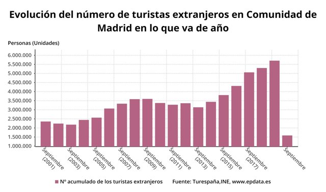 El pasado mes de septiembre en la Comunidad de Madrid se registraron un total de 66.196 etapas de viajes, con pernoctación incluida, lo que supone un 90,1% menos que en el mismo mes de 2019, y se contabilizaron un total de 355.720 pernoctaciones, lo que supone una caída del 89,1% respecto a hace un año.