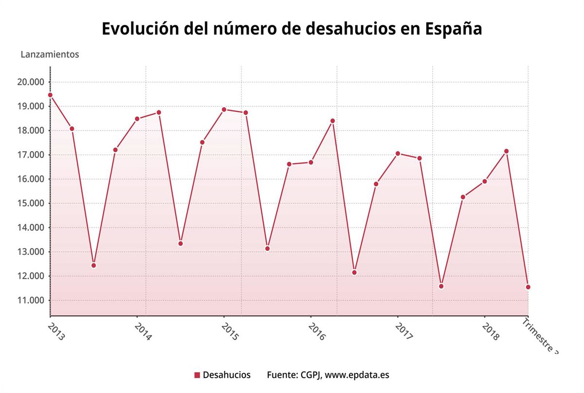 Respecto al cuarto trimestes de 2018, a nivel nacional el número de deshaucios se situó en 15.065, lo que supone un descenso del 1,3 por ciento respecto al mismo periodo de 2017.