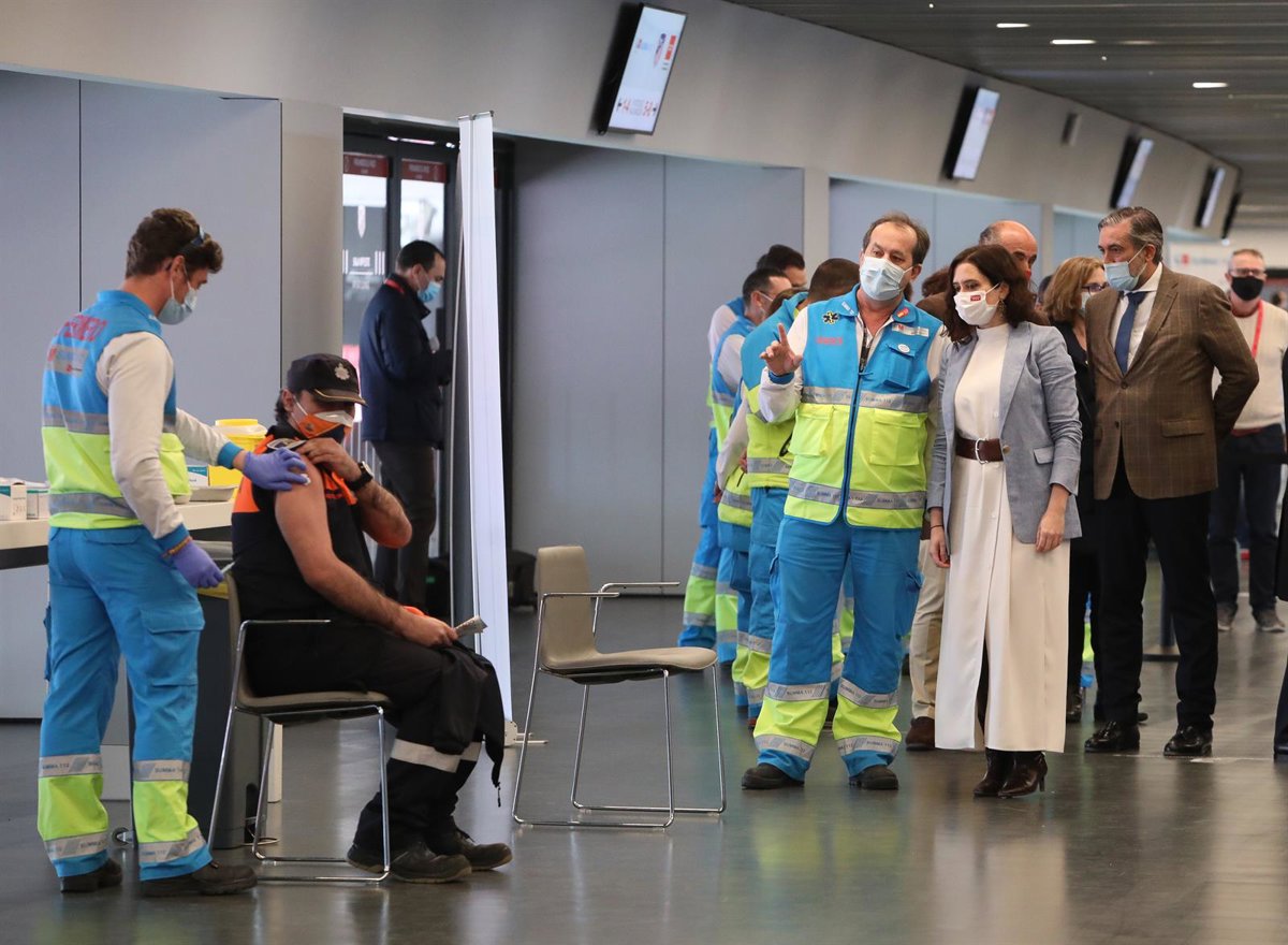 La presidenta de la Comunidad de Madrid, Isabel Díaz Ayuso habla con profesionales del SUMA 112 en el punto de vacunación del Wanda. Archivo. - Marta Fernández Jara - Europa Press