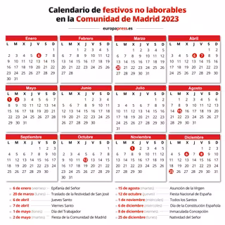 Así, las fiestas laborales de la Comunidad de Madrid en 2023 serán el 6 de enero (viernes), Epifanía del Señor; 20 de marzo (lunes), por traslado de la festividad de San José; 6 de abril, Jueves Santo; 7 de abril, Viernes Santo; 1 de mayo (lunes), Día del Trabajador; 2 de mayo (martes) Fiesta de la Comunidad de Madrid; 15 de agosto (martes), Asunción de la Virgen; 12 de octubre (jueves), Fiesta Nacional de España; 1 de noviembre (miércoles), Todos los Santos; 6 de diciembre (miércoles), Día de la Constitución Española; 8 de diciembre (viernes), Inmaculada Concepción; y el 25 de diciembre (lunes), Natividad del Señor.