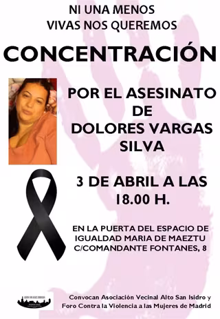 La Asociación Vecinal Alto de San Isidro y Foro Contra la Violencia a las Mujeres de Madrid han convocado para esta tarde a través de las redes sociales una manifestación en repulsa del asesinato a manos de su pareja de Dolores Vargas, vecina del distrito madrileño de Carabanchel.