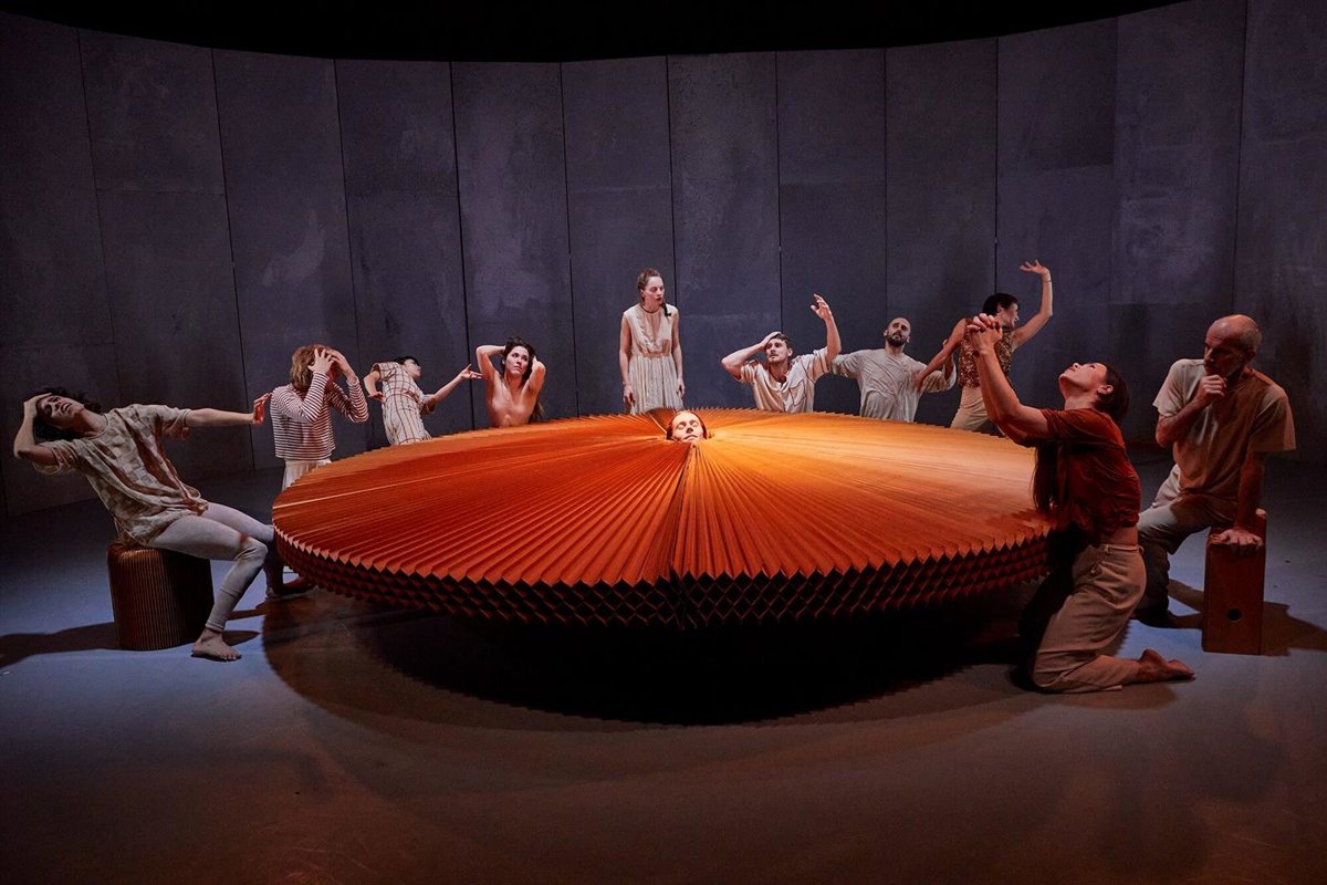 Para la puesta en escena, la directora opta por unas estructuras plegables de cartón, diseñadas por Kristin Torp y siempre manipuladas por los bailarines, que le permiten ir transformando rápidamente el espacio. Se despliegan como paredes y pueden ser muros de opresión que encierran a la gente, le cortan el paso o crean divisiones y simbolizan barreras sociales.