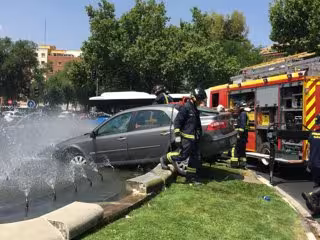 A causa del impacto, el coche se ha dirigido directo al centro de la fuente de la glorieta de Embajadores y, tras destrozar parte de los adoquines, ha acabado en el interior de la misma.