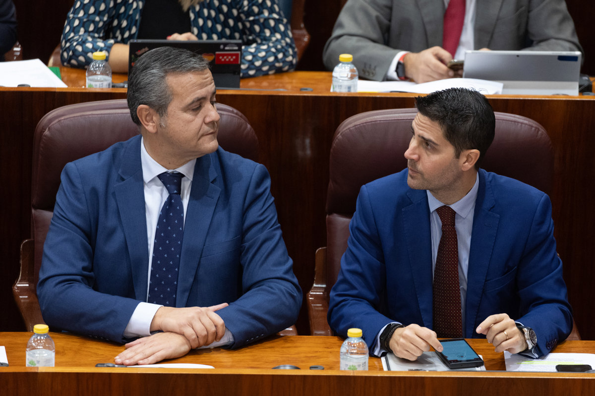 El consejero Vivienda, Transportes e Infraestructuras, Jorge Rodrigo (i) y el consejero de Educación, Ciencia y Universidades, Emilio Viciana durante el pleno de la Asamblea de Madrid, a 7 de diciembre de 2023, en Madrid (España). - Eduardo Parra - Europa Press